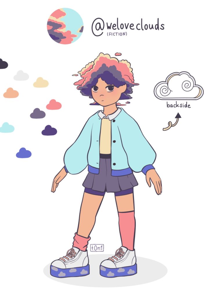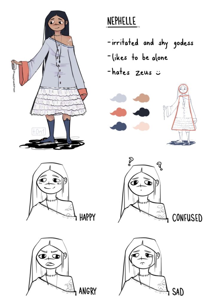 The cloud Nephelle (Νεφέλη) is an unknown and hidden nymph godess. She never had an identity neither a look. In NEPHELLE: THE LOST CLOUD she was given a character by Antonia Glienke and through this, her own freedom.